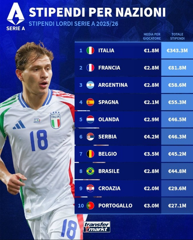 直播吧9月26日讯德国转会市场对意甲球员的薪资情况进行了盘点,意大利球员总薪资最高,而塞尔维亚球员的平均年薪最高。