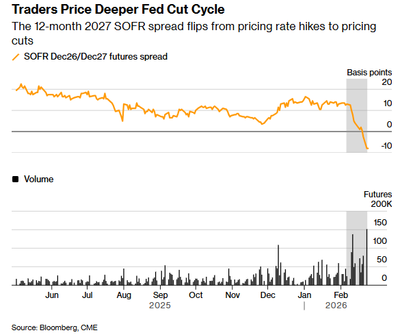 数据显示,2026年12月与2027年12月的12个月期SOFR利差上周五开始转负,周二这一倒挂幅度扩大至-8个基点,表明投资者已从定价2027年加息转向定价降息。周一交易时段该12个月期利差成交量突破15万手,创历史新高。