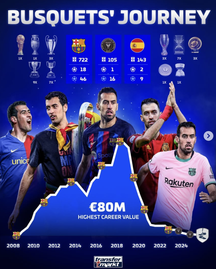 布斯克茨为巴塞罗那出战722场(18球46助攻);为迈阿密国际出战105场(1球16助攻);为西班牙国家队出战143场(2球9助攻)。他总共获得了以下荣誉: