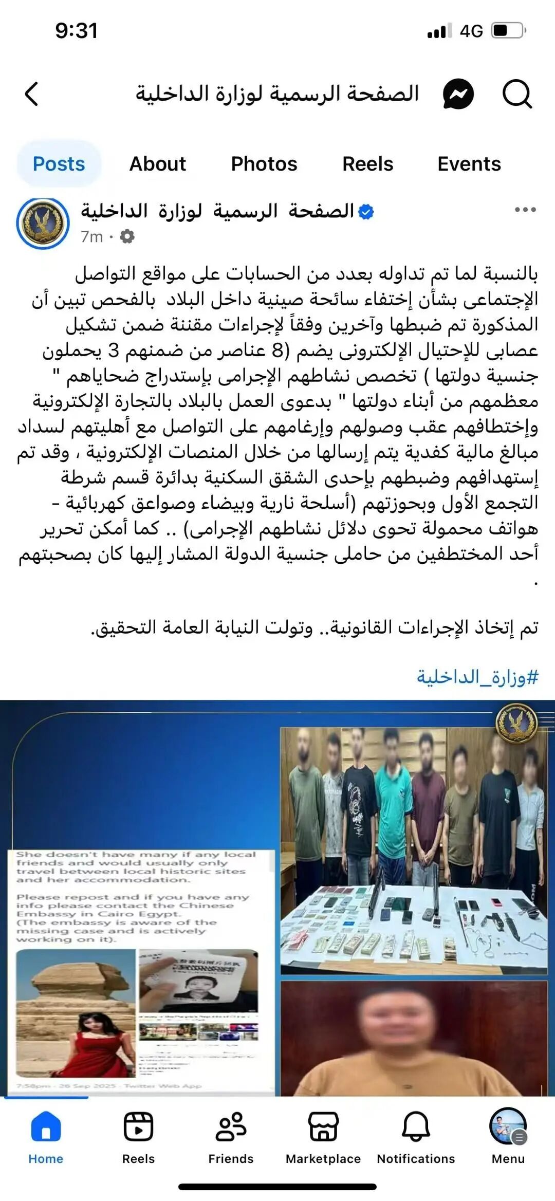 文中称:关于部分社交媒体账号所传播的有关一名中国女游客在埃及境内失踪的消息。经调查核实,她与其他几人已被依法控制,因其隶属于一个专门从事电子诈骗的犯罪团伙(该团伙共8名成员)。该团伙的犯罪活动主要是以在埃及从事电子商务工作为名,诱骗受害者(大部分是其本国同胞),待其抵达后便实施绑架,并强迫他们与家人联系,以支付通过电子平台发送的赎金。